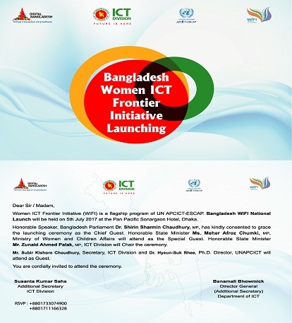 Bangladesh Women ICT Frontier Initiative(WIFI) Launching Women ICT Frontier Initiative(WIFI) শীর্ষক (Training of Trainers Workshop) TOT ওয়ার্কশপ টি আগামী ৩ ও ৪ জুলাই ২০১৭ তারিখে প্যান প্যাসিফিক সোনারগাঁ হোটেলের সুরমা/মেঘনা হল রুমে অনুষ্ঠিত হবে। উক্ত অনুষ্ঠানে প্রধান অতিথি হিসেবে বাংলাদেশ জাতীয় সংসদের মাননীয় স্পীকার "ড. শিরীন শারমিন চৌধুরী" , বিশেষ অতিথি হিসেবে মহিলা ও শিশু বিষয়ক মন্ত্রণালয়ের মাননীয় প্রতিমন্ত্রী "বেগম মেহের আফরোজ চুমকি" ও তথ্য ও যোগাযোগ প্রযুক্তি বিভাগের মাননীয় প্রতিমন্ত্রী "জুনাইদ আহমেদ পলক" উপস্থিত থাকতে সদয় সম্মতি জ্ঞাপন করেছেন।